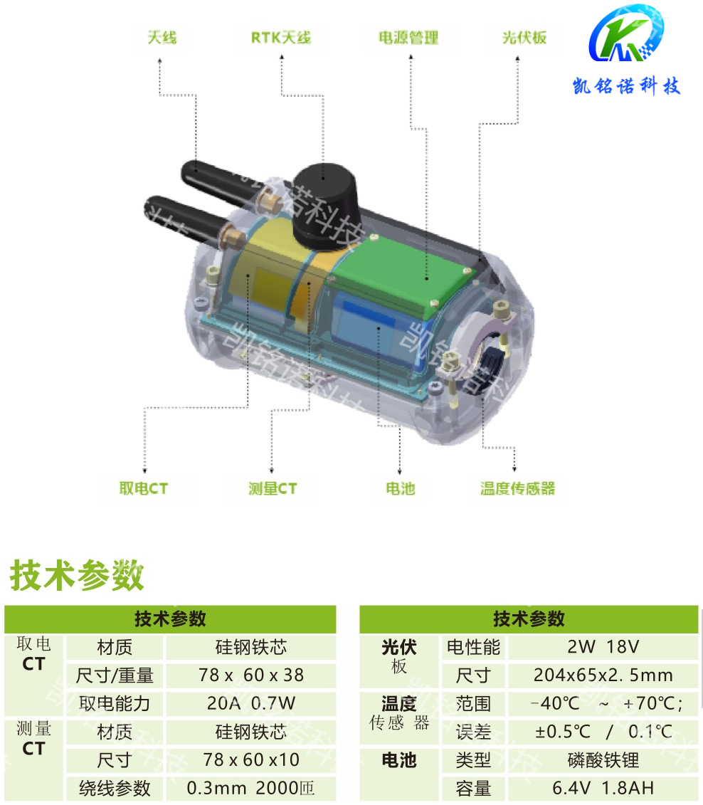 三、工作原理与功能的“双重奏”凯铭诺输电线路导线舞动监测装置是如何实现精准监测的呢?它采用了“多传感器融合+智能分析”的工作原理。 装置内置取电CT和测量CT,取电CT为装置自身供电,测量CT则用于感知导线的电流、振动等物理量变化;RTK天线能精准定位装置位置,结合振动数据可分析导线舞动的空间特征;温度传感器实时监测环境温度,为舞动分析提供气象参考;光伏板与电池组成的供电系统,续航能力强劲,确保装置在野外环境下长期稳定运行。 在功能方面,该装置堪称“全能选手”: 1.舞动监测:可精准捕捉导线的振动频率、振幅等关键参数,清晰还原舞动状态; 2.环境感知:实时监测温度、地理位置等信息,为舞动分析提供多维度数据支撑; 3.数据传输:能将监测数据实时上传至后台系统,让运维人员足不出户掌握线路状况; 4.智能预警:内置智能算法,当监测到异常舞动时,可及时发出预警,为运维决策争取时间。 四、装置性能的“硬指标”凯铭诺监测装置的性能可通过一系列技术参数直观体现: 1.取电CT与测量CT:均采用硅钢材质,取电CT取电能力达20A 0.7W,测量CT尺寸绕线参数为0.3mm 2000匝,确保电流与振动监测的高精度; 2.温度传感器:测温范围覆盖-40℃~+70℃,误差仅±0.5℃/0.1℃,能精准反映环境温度变化; 3.光伏板:兼顾发电效率与安装便利性。