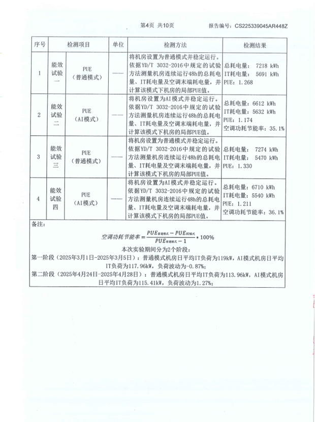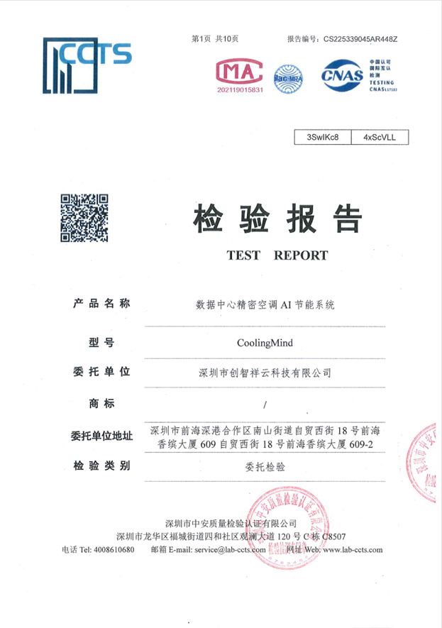 近期,CoolingMind数据中心精密空调AI节能系统,通过深圳市中安质量检验认证有限公司(具备CNAS、CMA资质)的权威检测。本次检验标准严格遵循GB 50174-2017《数据中心设计规范》和YD/T 3032-2016《通信局站动力和环境能效要求和评测方法》,采用近似日对比法,确保测试结果的科学性和准确性,最终数据显示系统空调节能率达到超35%,为数据中心行业绿色转型提供了可靠的技术支撑。