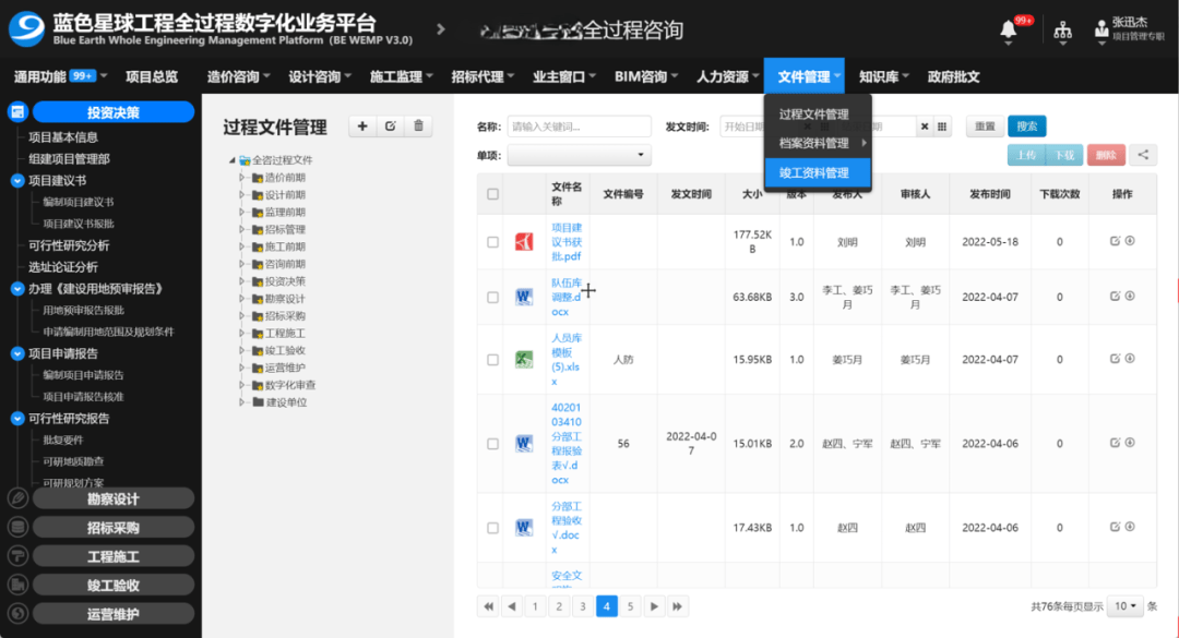 为数字化交付奠定坚实基础 工程项目竣工后的数字化交付是行业数字化转型的关键环节。传统模式下,竣工资料整理是一项极其繁重的工作,需要从各个部门收集散落的数据,整理成统一的竣工文档。蓝色星球平台的“数据一次录入、全员共享”机制使得竣工资料在项目进行过程中已自然形成并结构化存储。 项目竣工时,系统可以自动生成符合规范的数字化竣工档案,实现“一键归档”。这不仅大幅降低了竣工阶段的工作量,更重要的是确保了竣工资料与实际情况的一致性,为后续的资产管理和运维提供了可靠的数据基础。